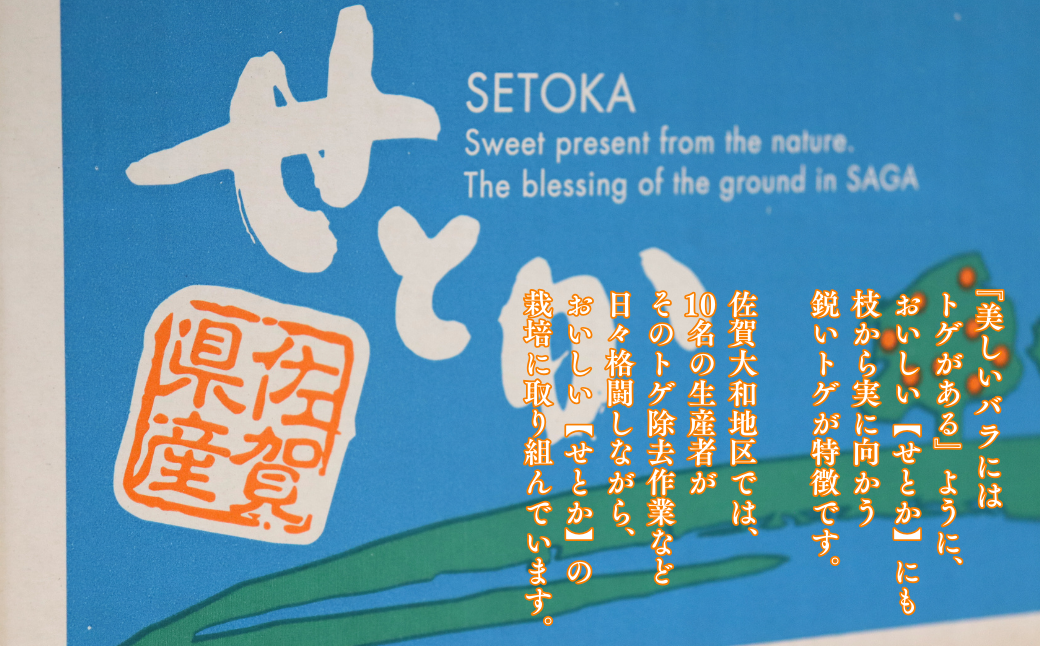 佐賀大和地区では、10名の生産者がそのトゲ除去作業など日々格闘しながら、おいしいせとかの栽培に取り組んでいます。