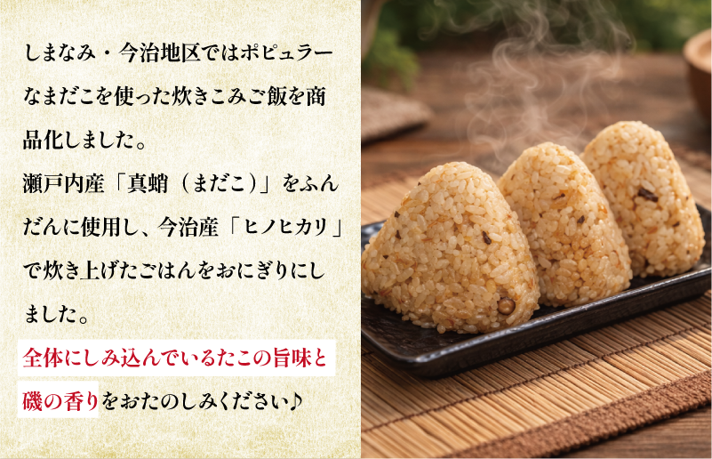 しまなみ・今治地区ではポピュラーなまだこを使った炊きこみご飯は、たこの旨味が全体にしみこみ、 磯の香り豊かな優しい味に仕上げています。
