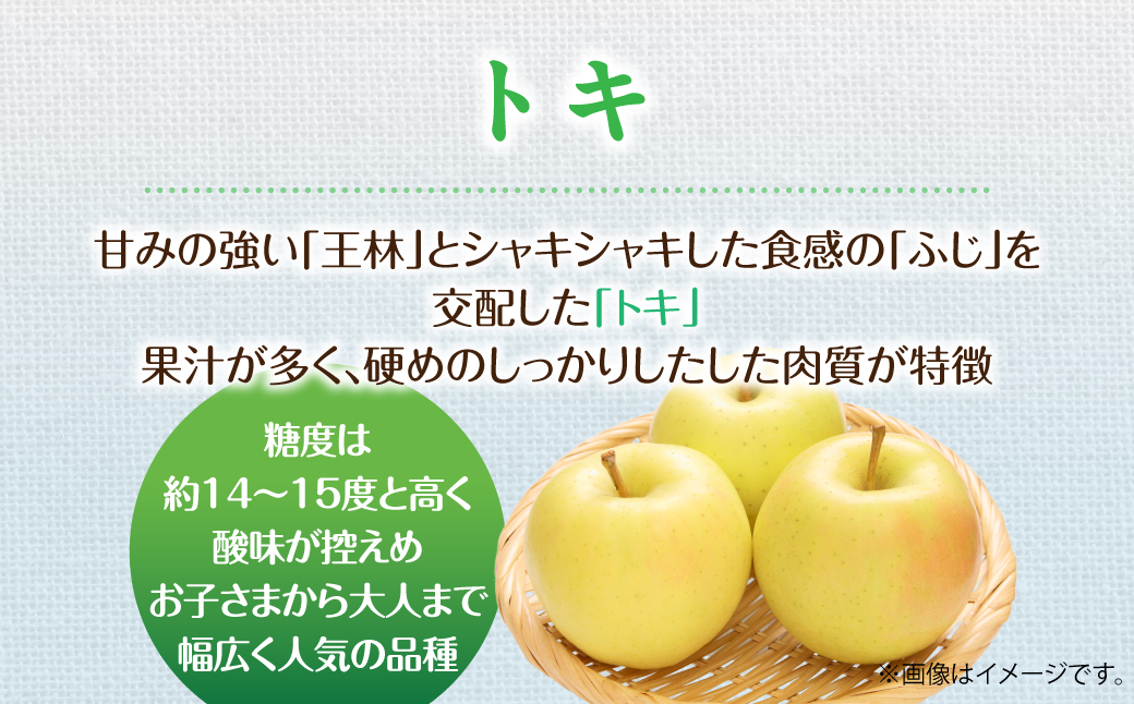 「トキ」は、甘みの強い「王林」とシャキシャキした食感で人気の「ふじ」を交配した黄色いりんごで、果汁が多く、硬めのしっかりしたした肉質が特徴です。糖度は約14~15度と高く、酸味が控えめなので、お子さまから大人まで幅広く人気の品種です。
