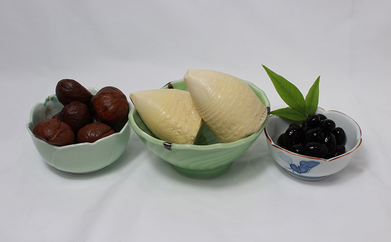 黒豆甘露煮・栗渋皮煮:各560g 筍水煮:820g 原材料:黒豆、栗、筍、砂糖