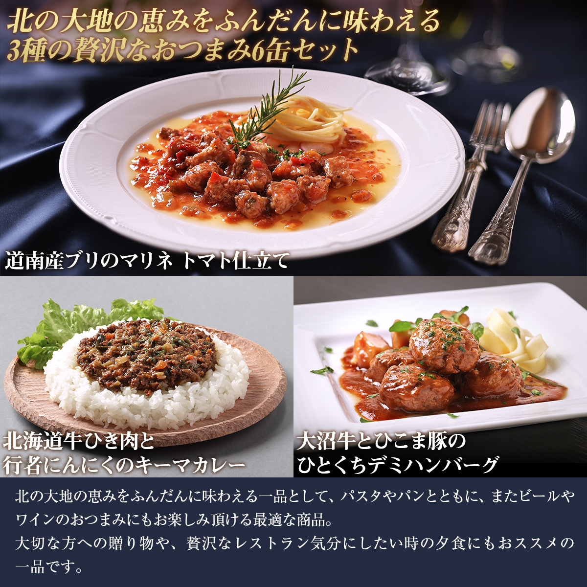 北海道牛ひき肉と行者にんにくのキーマカレー170g×2缶・道南産ブリのマリネ トマト仕立て170g×2缶・大沼牛とひこま豚のひとくちデミハンバーグ170g×2缶