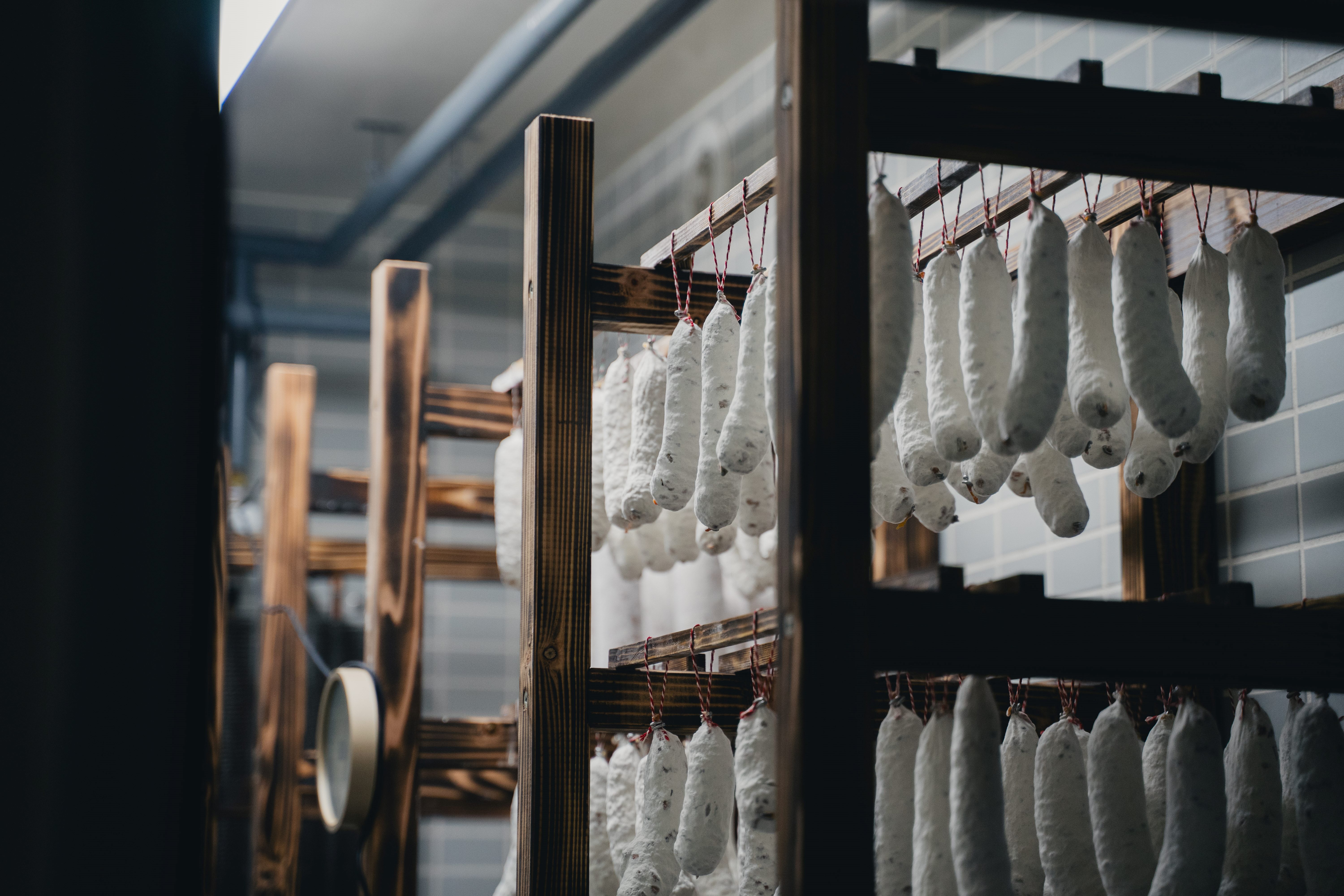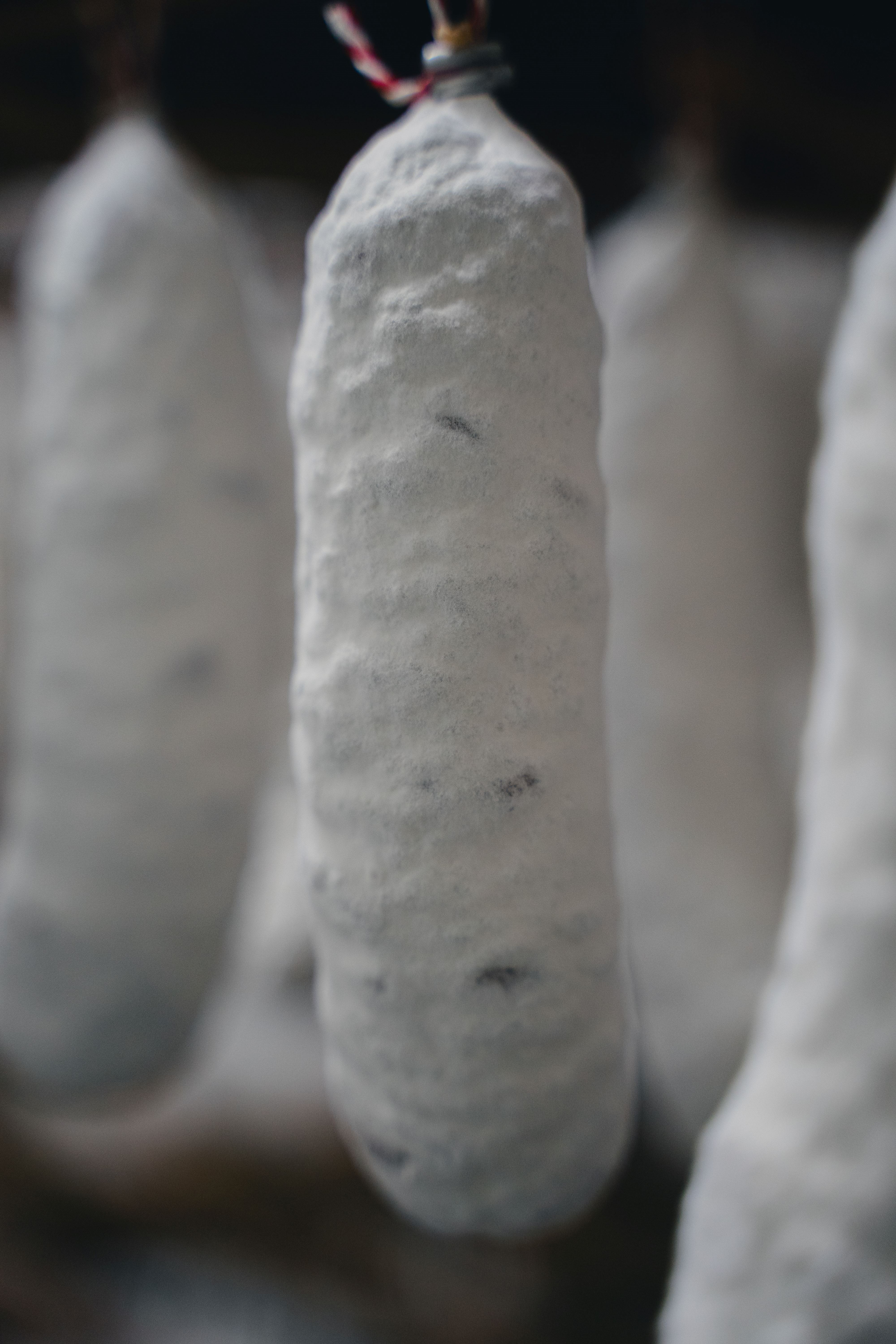 1ヶ月間じっくり熟成させた「白カビドライソーセージ」は、凝縮された豚肉の旨味と芳醇な香りが特徴です。
