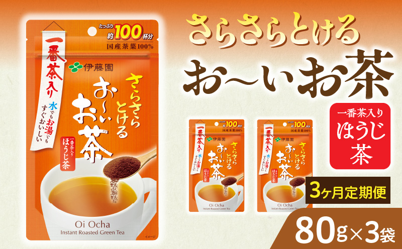 3ヶ月 定期便 さらさらとける おーいお茶 ほうじ茶 粉末茶 粉末 伊藤園 一番茶 直火焙煎 80g 3袋 冷水 すぐ溶ける チャック付 旨み 味わい 香ばしさ 独自原料 インスタント 時短 簡単 手軽 お取り寄せ 愛知県 小牧市