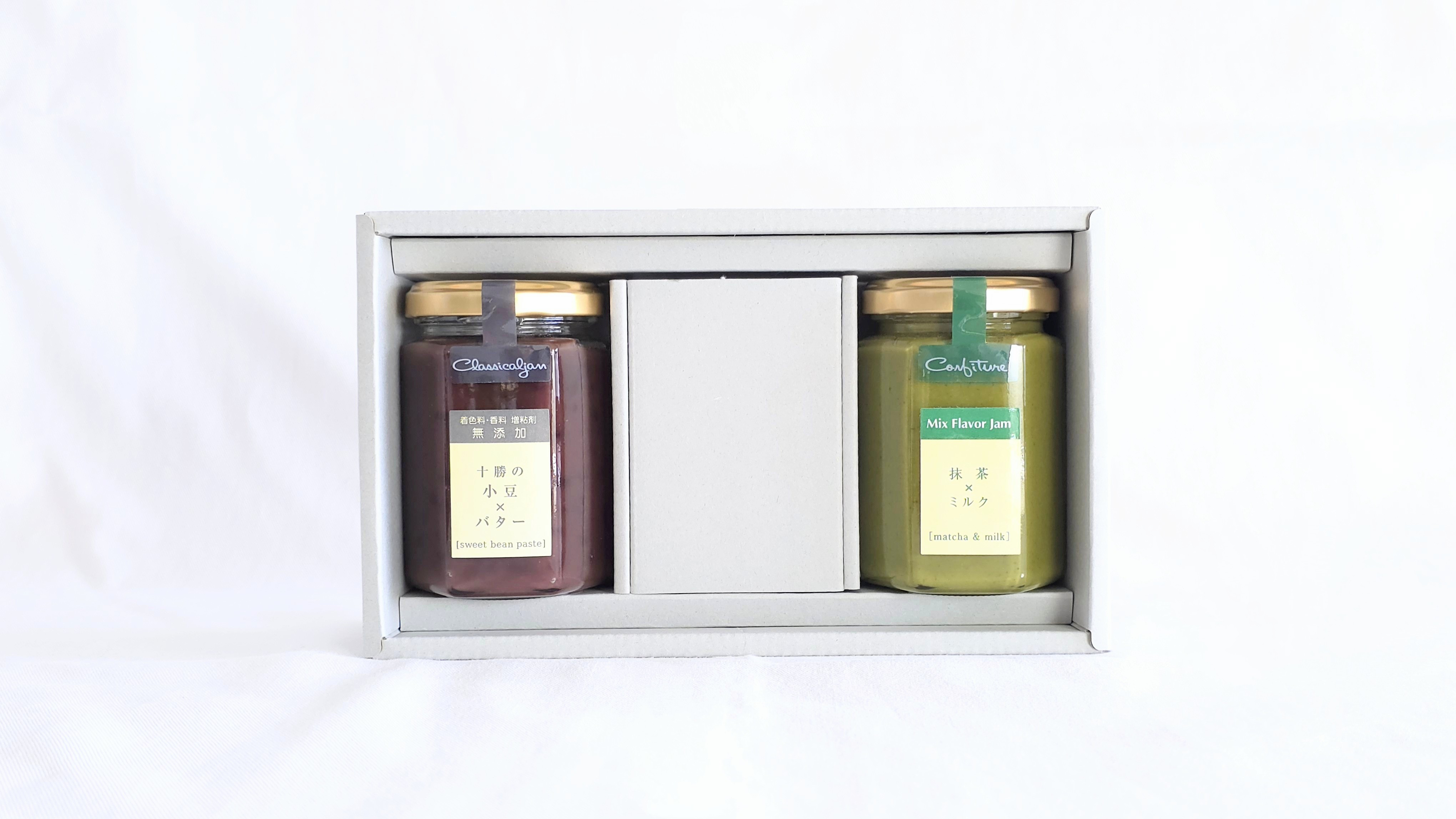 十勝の小豆×バター、抹茶×ミルク 各150g(瓶詰)各1本 計2本 化粧箱入り