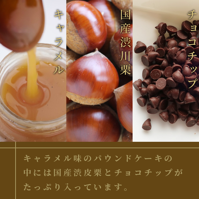 原材料:砂糖、卵、渋皮栗、マーガリン、小麦粉、チョコチップ、アーモンド、ヘーゼルパウダー、シナモン、膨張剤