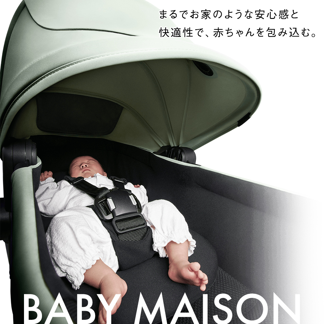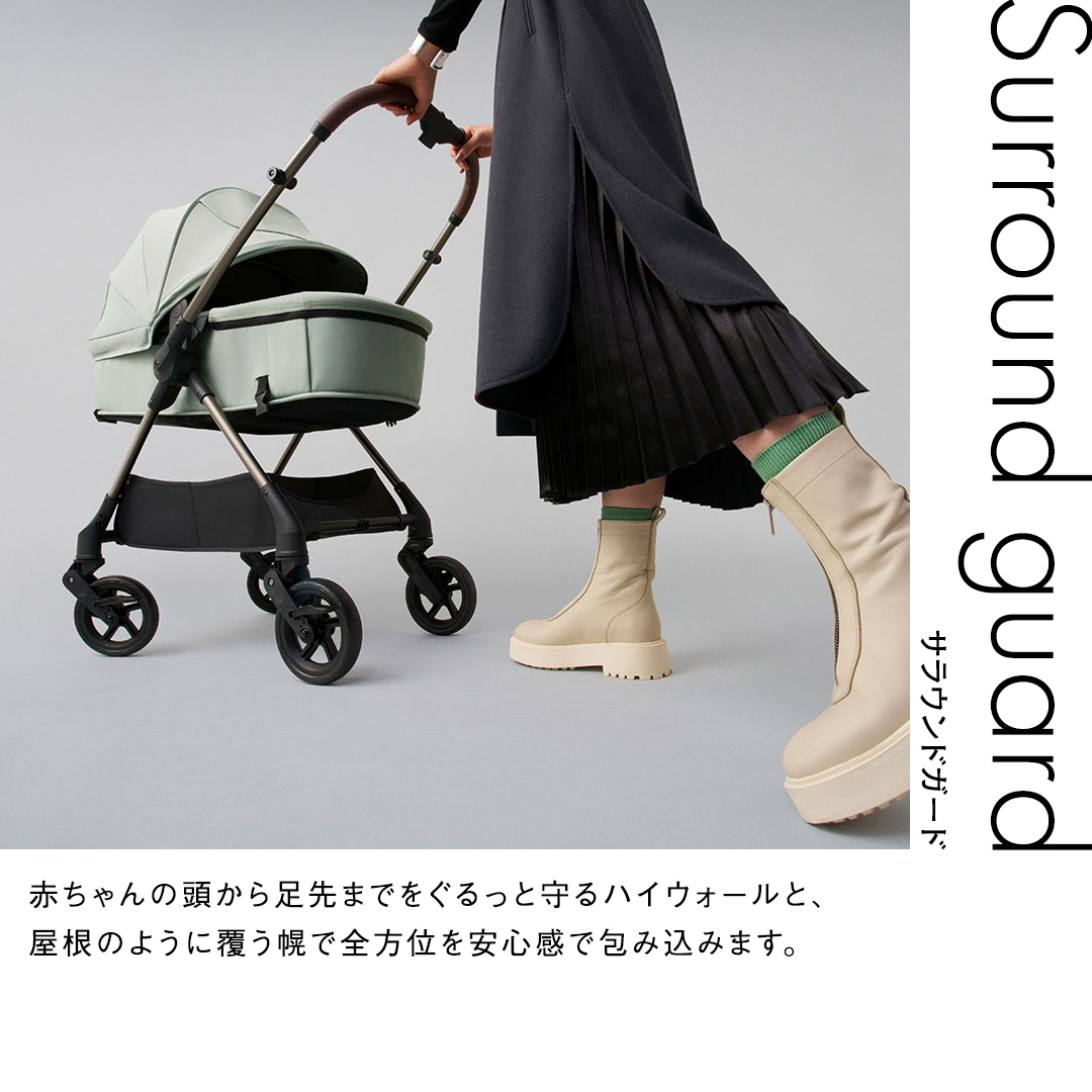 赤ちゃんの頭から足先までをぐるっと守るハイウォールと、屋根のように覆う幌で全方位を安心感で包み込みます。