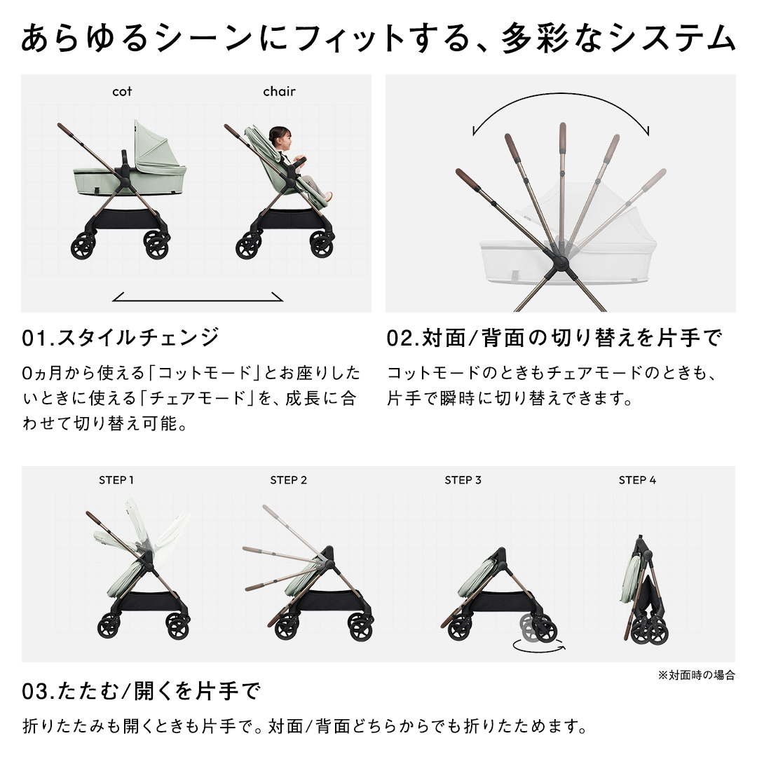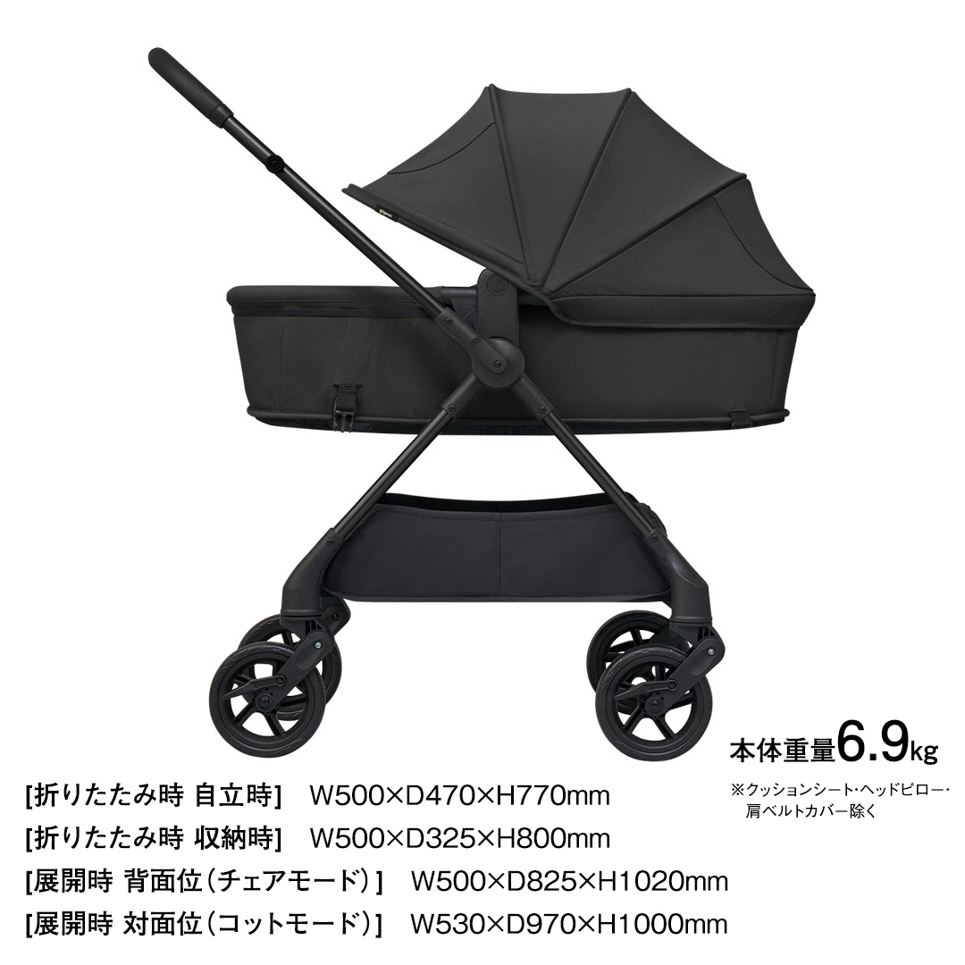 0ヵ月から使える「コットモード」とお座りしたいときに使える「チェアモード」を、成長に合わせて切り替え可能。