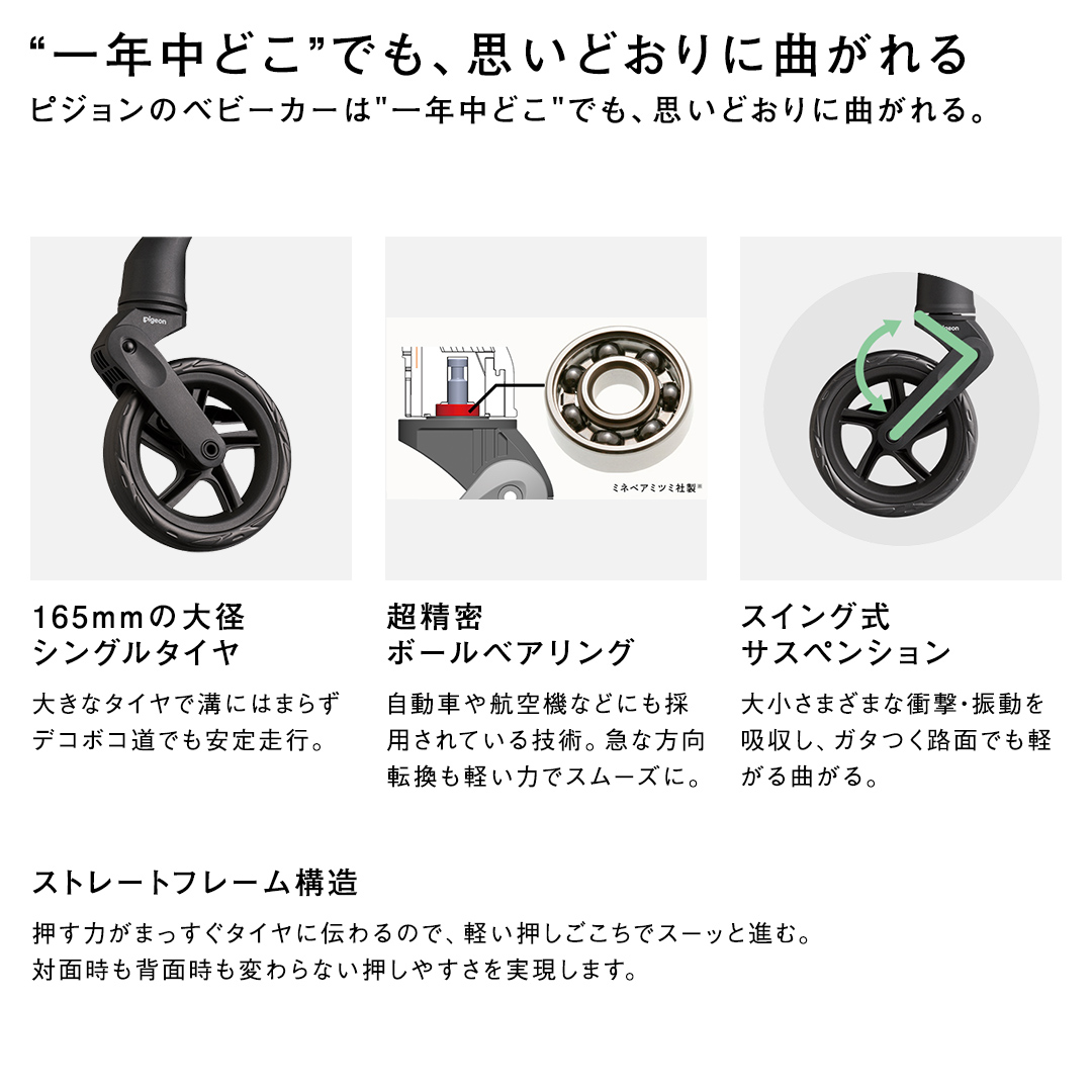 ・ストレートフレーム構造:押す力がまっすぐタイヤに伝わるので、軽い押しごこちでスーッと進む。対面時も背面時も変わらない押しやすさを実現します。