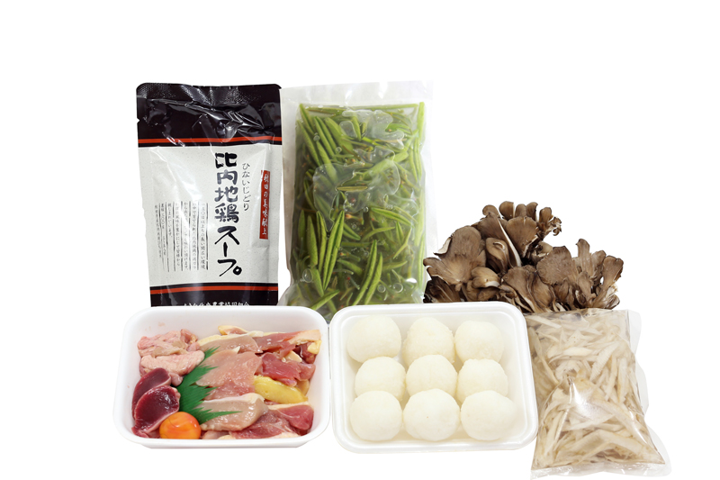 ■内容量:生じゅんさい500g、鶏肉190g、だまこもち30g×9コ、ささがきゴボウ60g、まいたけ90g、比内地鶏スープ300g×1袋