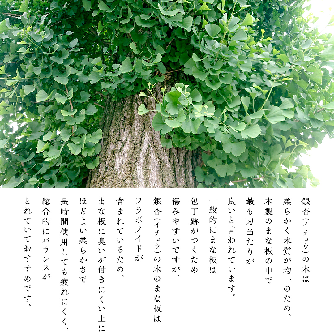 銀杏の木は包丁を痛めにくく抗菌作用もある、衛生面でも良い“優しいまな板”となっています。