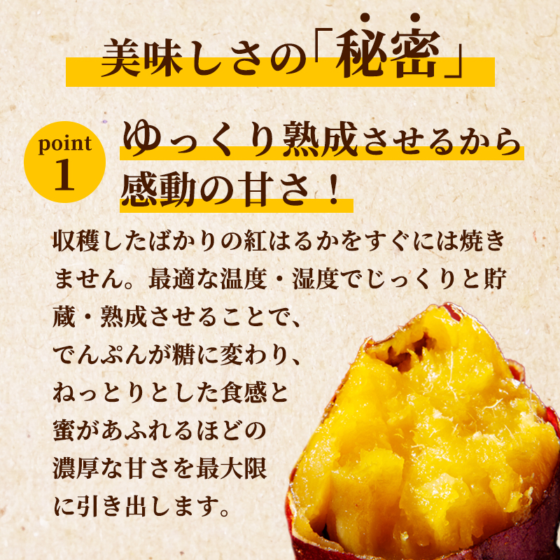 収穫したばかりの紅はるかをすぐには焼きません。最適な温度・湿度でじっくりと貯蔵・熟成させることで、でんぷんが糖に変わり、ねっとりとした食感と蜜があふれるほどの濃厚な甘さを最大限に引き出します。
