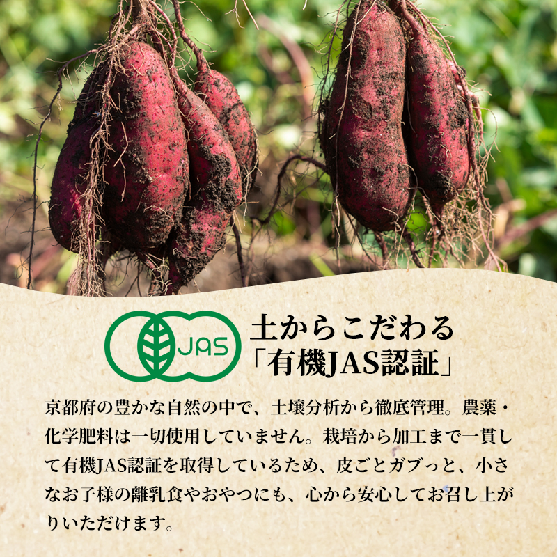 京都府の豊かな自然の中で、土壌分析から徹底管理。栽培期間中、農薬・化学肥料は一切使用していません。栽培から加工まで一貫して有機JAS認証を取得しているため、皮ごとガブっと、小さなお子様の離乳食やおやつにも心から安心してお召し上がりいただけます。