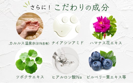 成分:温泉水 、水、BG、PG、ナイアシンアミド、ぺンチレングリコール、トレハロース、ハマナス花エキス、ツボクサエキス 、アルギニン、キシリトール、ハマメリスエキス、乳酸、ヒドロキシエチルウレア、グルタミン酸、ヒスチジン酸、ビオサッカリドガム-1、ヒアルロン酸Na、ビルベリー葉エキス 、プルーン分解物、カンゾウ根エキス、ビャクダン木エキス、クリサンテルムインジクムエキス、イチョウ葉エキス、アカヤジオウ根エキス、PCA-Na、乳酸Na、エチルヘキシルグリセリン、フェノキシエタノール、カプリリルグリコール