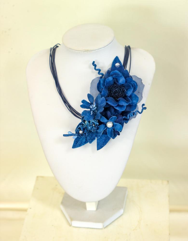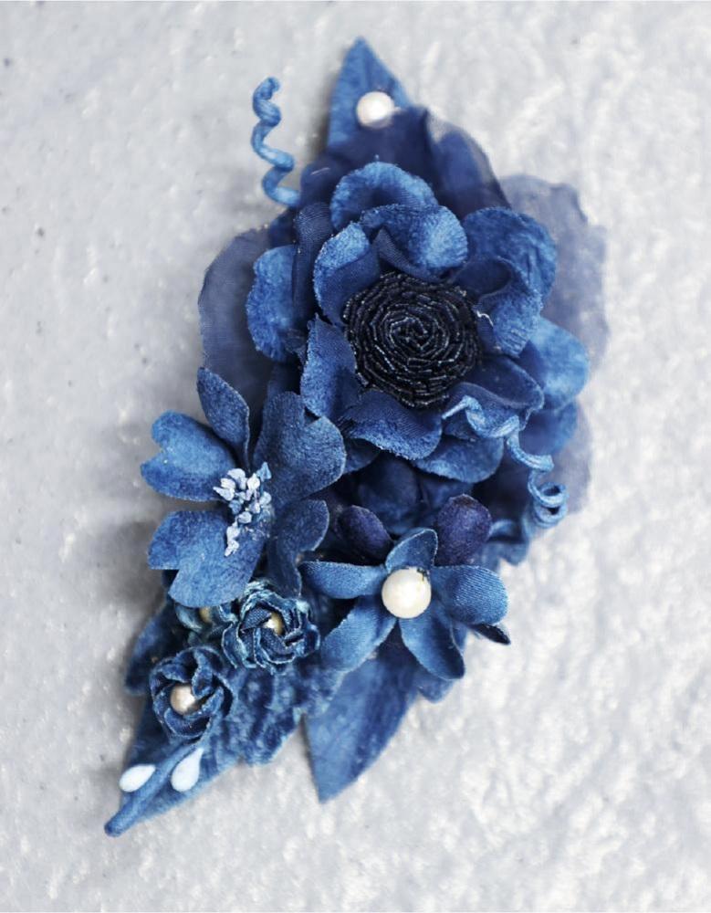 本藍染で染めた布で花の形に一枚一枚カットし、手ゴテを当てて作り上げたコサージュです。紐付きなのでネックレスとしてもお使いいただけます。藍色はあらゆる色の洋服にも融合いたしますので、合わせやすくギフトにも最適です。