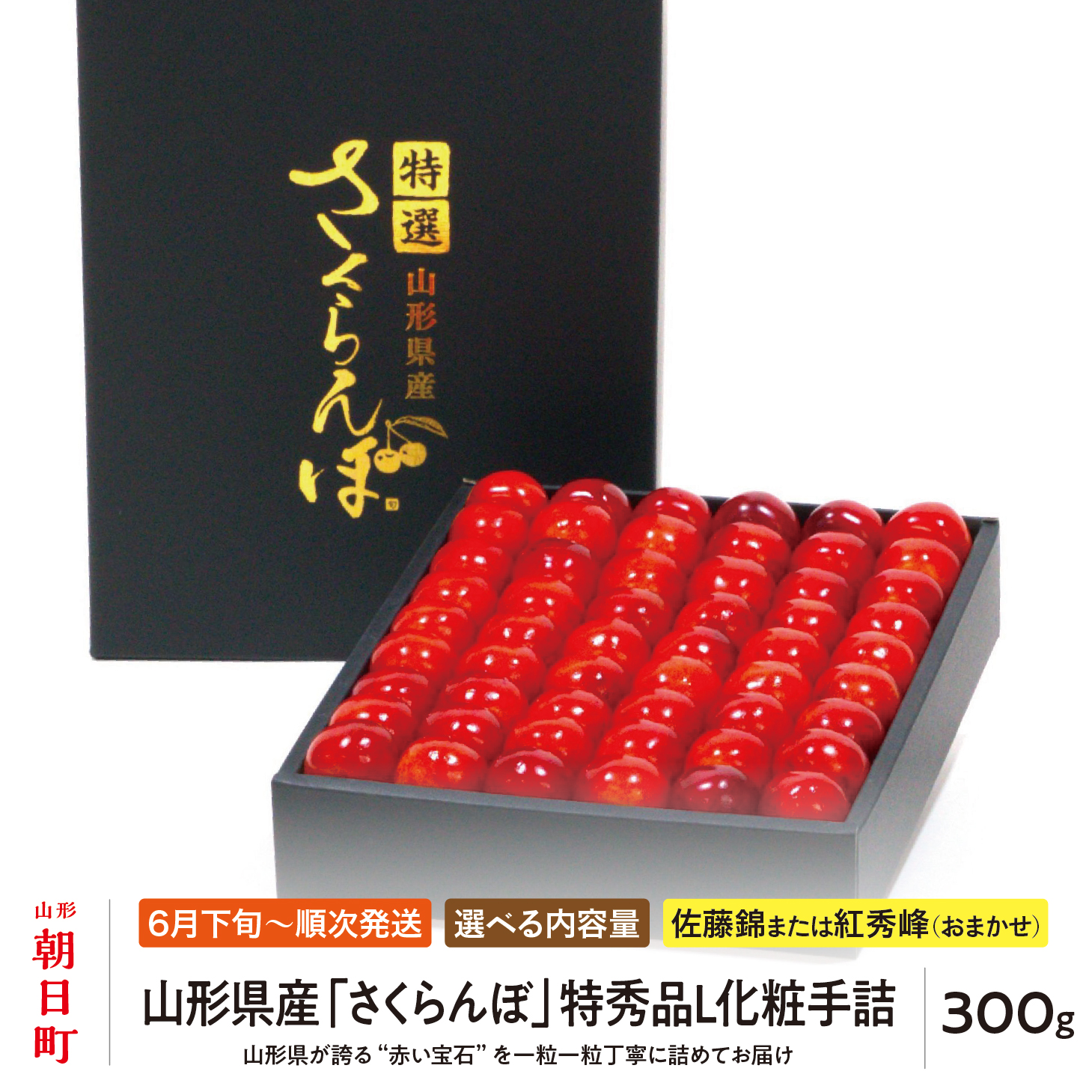 【品種】さくらんぼ ( 佐藤錦 ・ 紅秀峰 ) 【容量】特秀品(L サイズ): 1箱 約300g