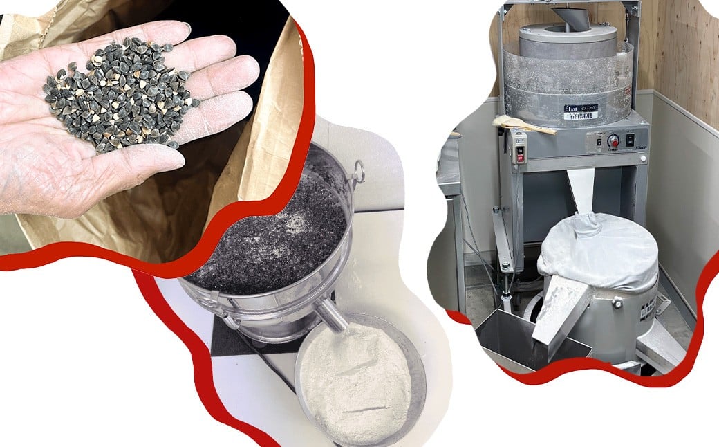 玄蕎麦を丹精込め石臼を使用し根耒ファームで自家製粉をすることにより香りの高さと風味の濃さが格別です。