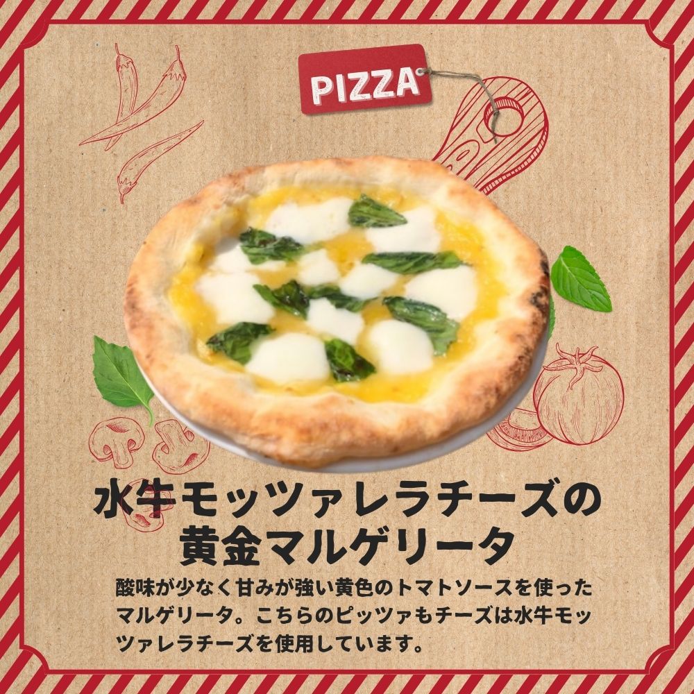 酸味が少なく甘みが強い黄色のトマトソースを使ったマルゲリータ。