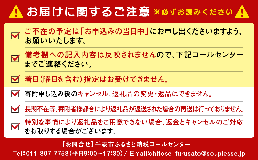 千歳市ふるさと納税コールセンター(TEL:011-807-7753 平日9:00〜17:30)