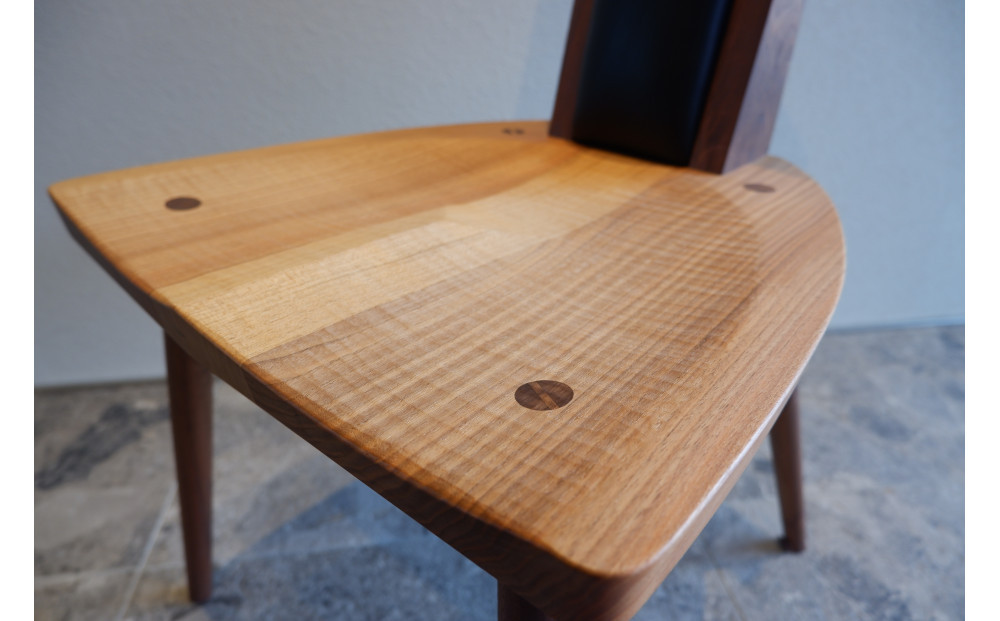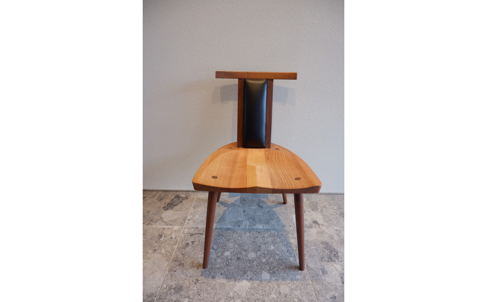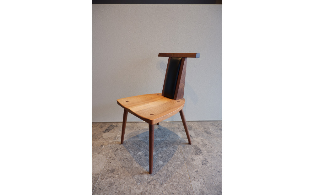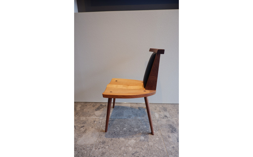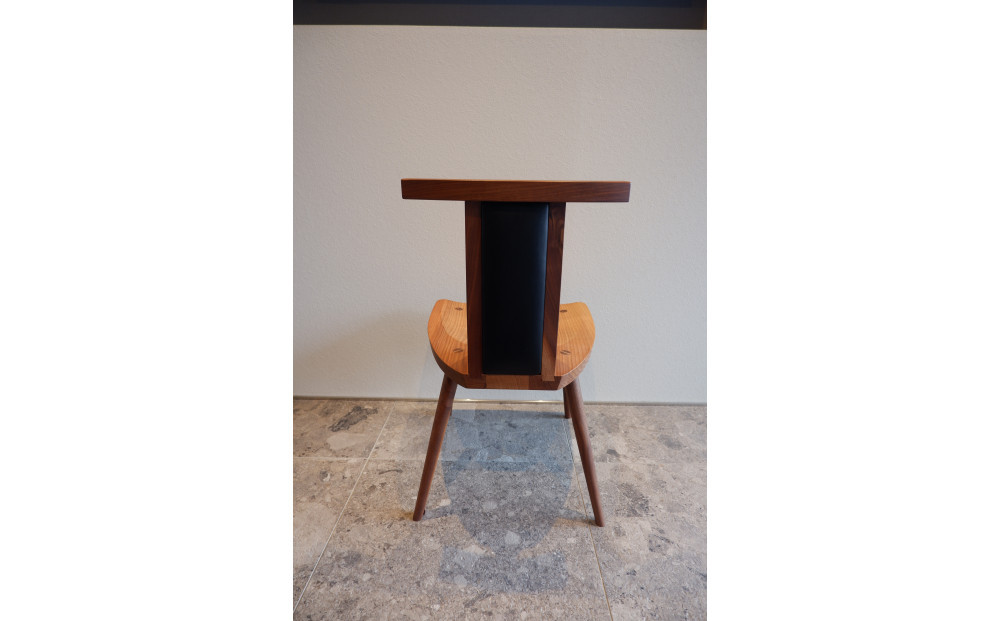 無垢材の温もりと本革の上質感を融合させたダイニングチェア。座面は胡桃材、背もたれはウォールナット材を使用。背部の本革部分はブラック。シンプルながらも洗練されたデザインで、ダイニングチェアとしても、デスクチェアとしてもご使用いただけます。