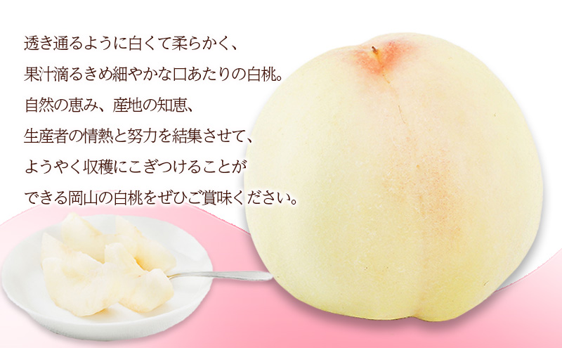透き通るように白くて柔らかく、果汁滴るきめ細やかな口あたりの白桃。自然の恵み、産地の知恵、生産者の情熱と努力を結集させて、ようやく収穫にこぎつけることができる岡山の白桃をぜひご賞味ください。