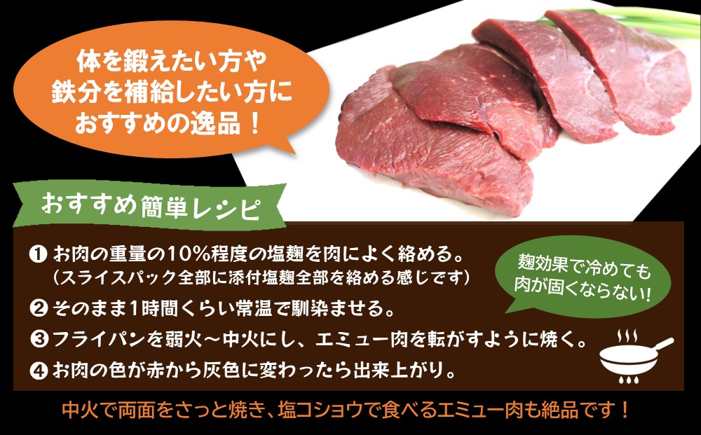麹効果で冷めても肉が固くならず、エミュー肉の味と麹の焼けた香りが食欲をそそります。