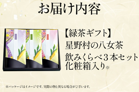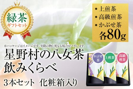 星野村の新茶を上煎茶、高級煎茶、かぶせ茶の計3本を新茶専用の化粧袋で包み、化粧箱にお入れしてお届けします。
