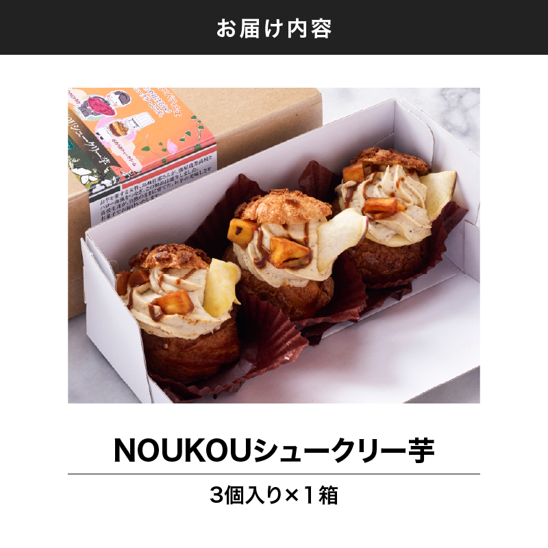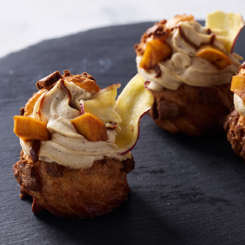 しっかりと焼き上げたクッキーシューに、大学芋や芋の蜜漬けをデコレーションしました。