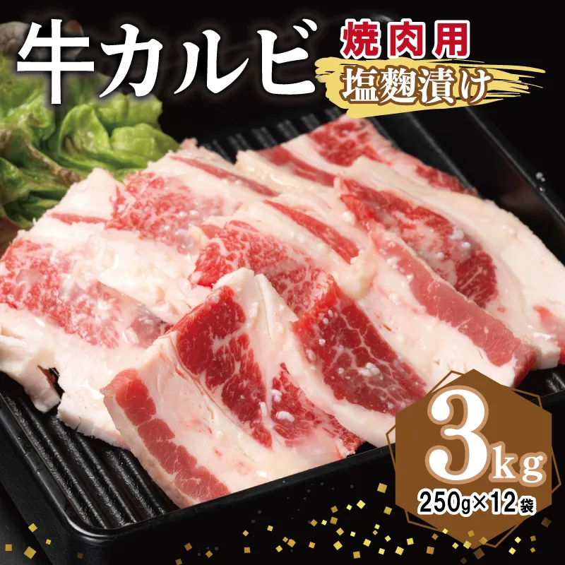 牛カルビ 焼肉用 塩麹漬け 合計3kg【味付け 小分け 焼くだけ 簡単調理 BBQ 牛肉 250g×12袋】 G3398